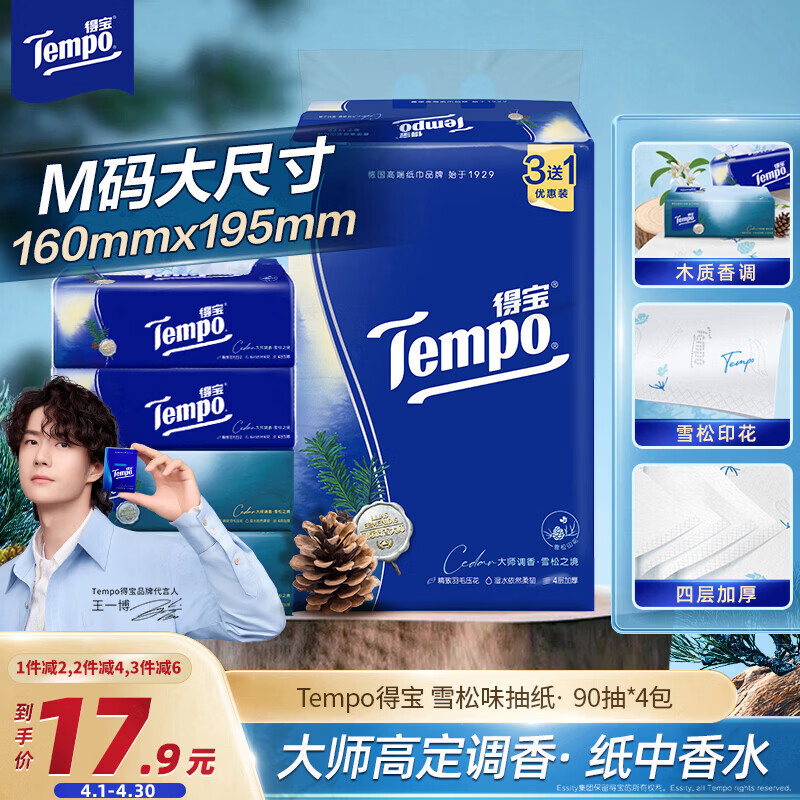 得宝(TEMPO)抽纸 高定调香雪松印花 4层90抽*4包 湿水不易破 餐巾纸 卫生纸