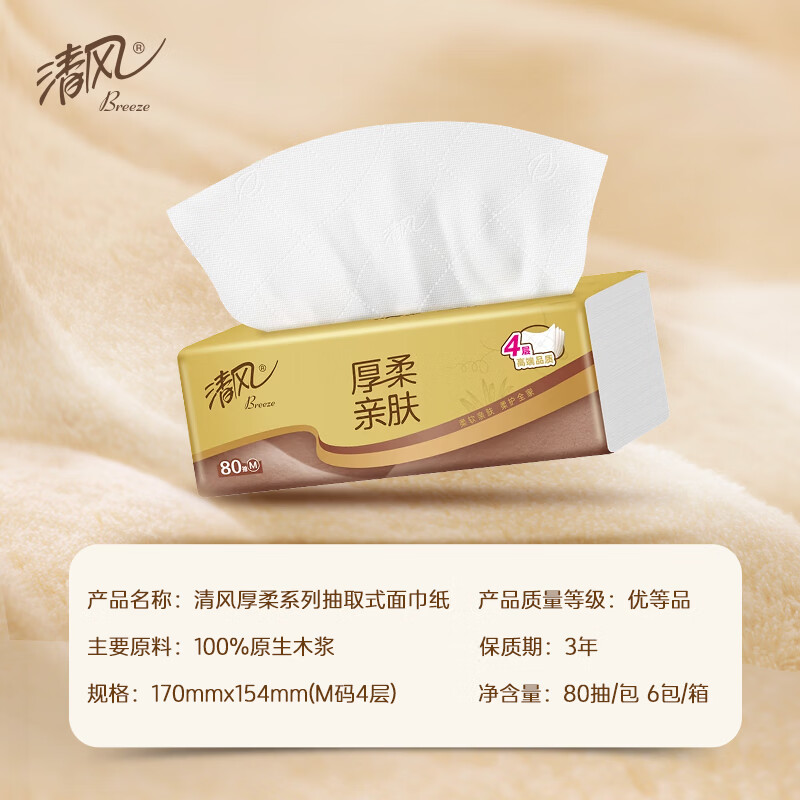 清风抽纸 厚柔4层80抽*6包M码 亲肤无刺激卫生纸抽 餐巾纸抽 提装纸巾
