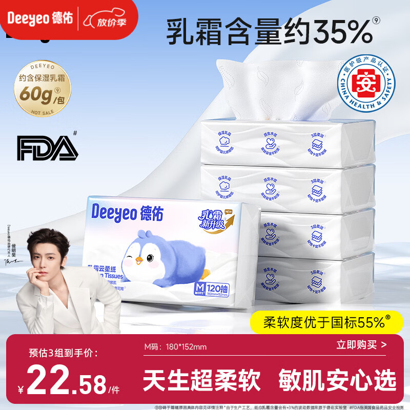 德佑云柔巾婴儿适用乳霜纸柔纸巾抽纸宝宝云柔巾120抽5包