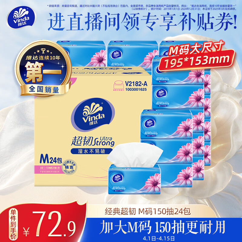维达(Vinda)抽纸【孙颖莎推荐】超韧3层150抽*24包M码 纸巾卫生纸 餐巾纸整箱