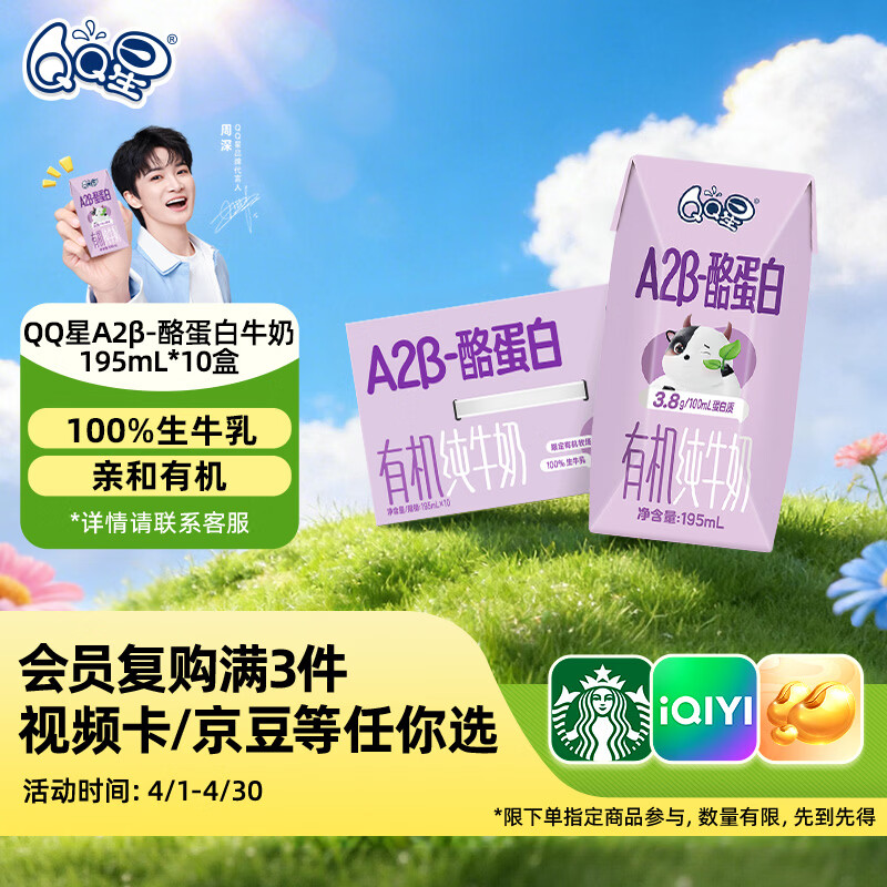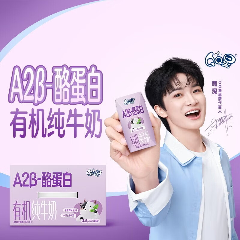 QQ星原生A2β-酪蛋白有机儿童纯牛奶195ml*10盒/箱【周深同款QQ星】