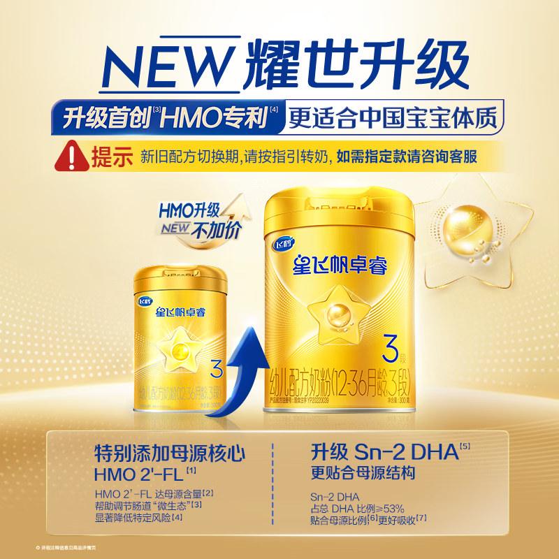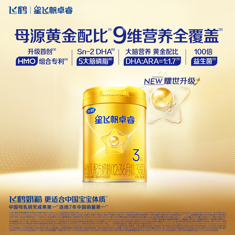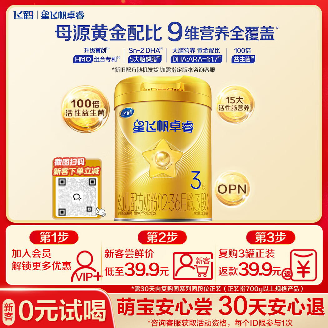 飞鹤星飞帆卓睿 婴幼儿配方奶粉3段(1-3岁)300克 育儿补贴 0元试用