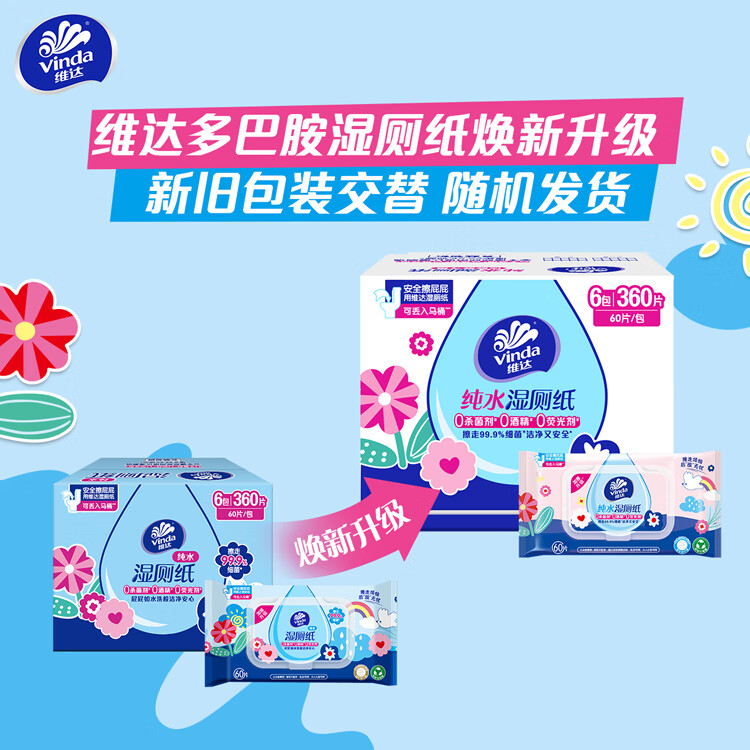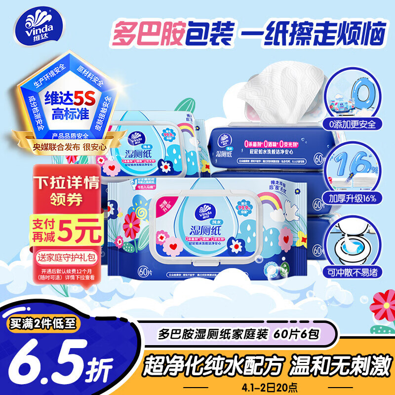 维达(Vinda)湿厕纸 家庭装60片*6包 多巴胺湿厕纸纯水湿纸巾厕纸湿巾新旧随机
