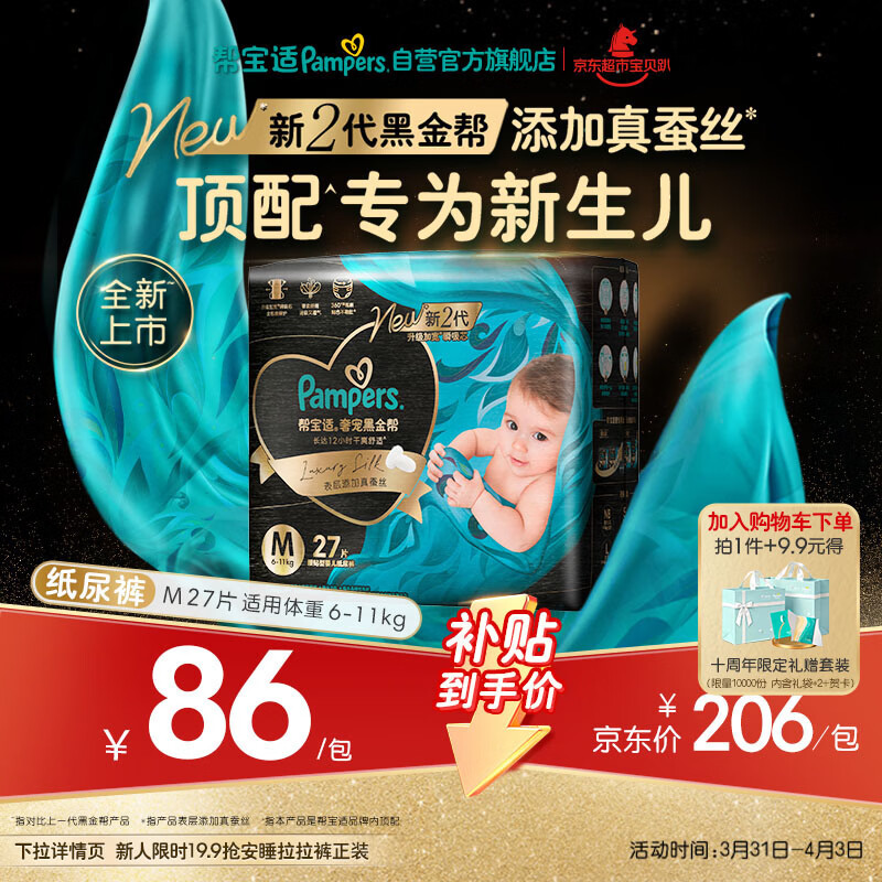帮宝适新生儿顶配黑金帮纸尿裤婴儿尿不湿尿片添加真蚕丝M27