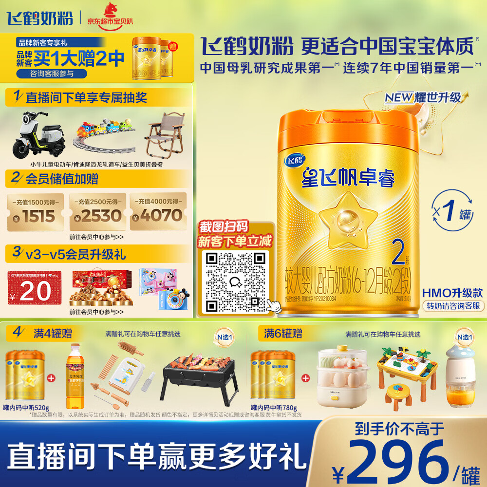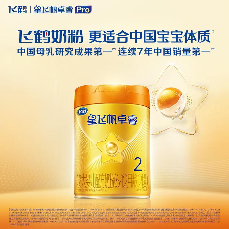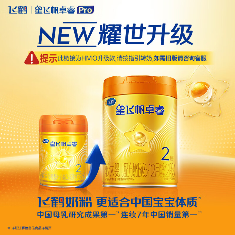 飞鹤星飞帆卓睿Pro A2β酪蛋白婴儿配方奶粉2段(6-12月)758g 育儿补贴