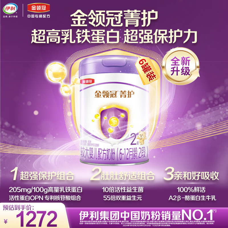 伊利金领冠菁护较大婴儿奶粉2段6-12月800g*6罐 A2β-酪蛋白 乳铁蛋白