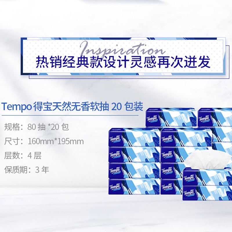 得宝(TEMPO)一博同款 抽纸无香4层80抽*20包M码 湿水不易破 纸巾 餐巾纸