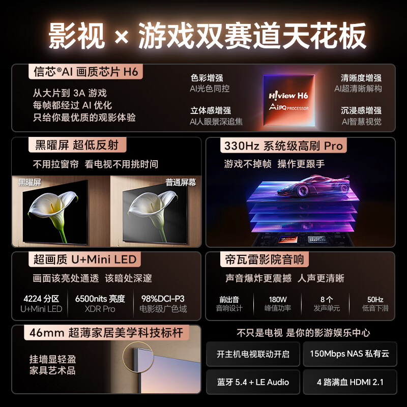 海信电视E8Q 85英寸 信芯H6 4224分区U+MiniLED 黑曜屏 330Hz 帝瓦雷音响 国家补贴世界杯电视85E8Q