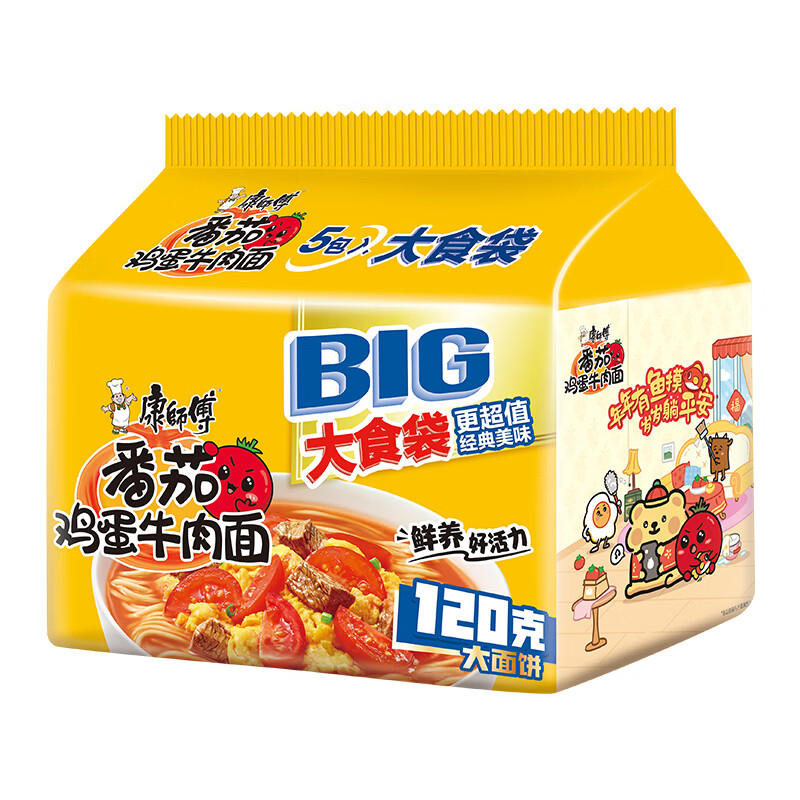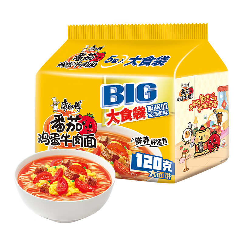 康师傅 方便面 大食袋番茄鸡蛋牛肉面五连包162g*5 泡面袋装