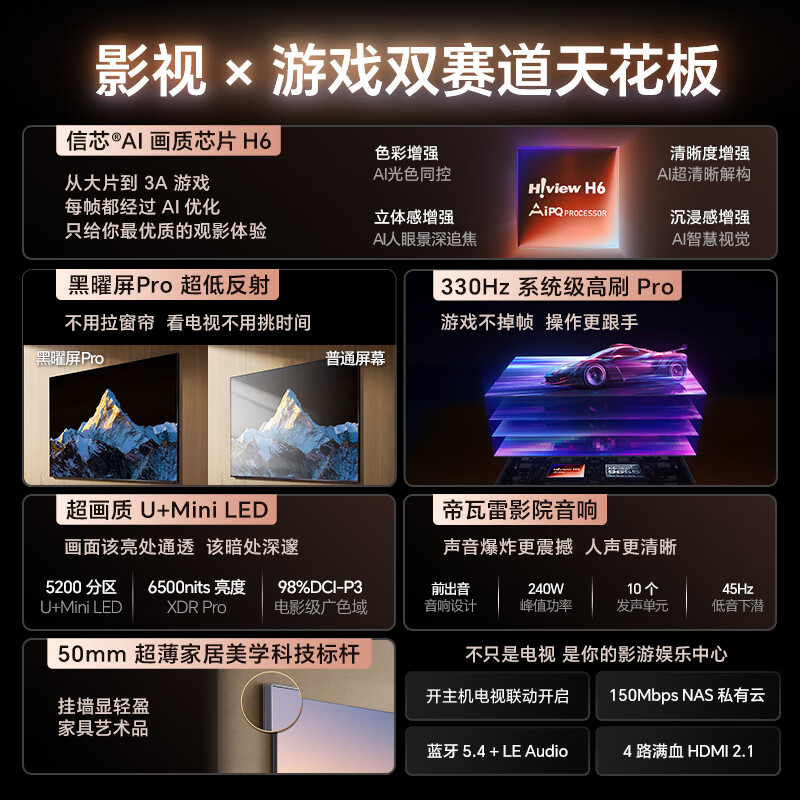海信电视E8Q 100吋 信芯H6 5200分区U+MiniLED 黑曜屏Pro 330Hz 帝瓦雷音响 国家补贴世界杯电视100E8Q