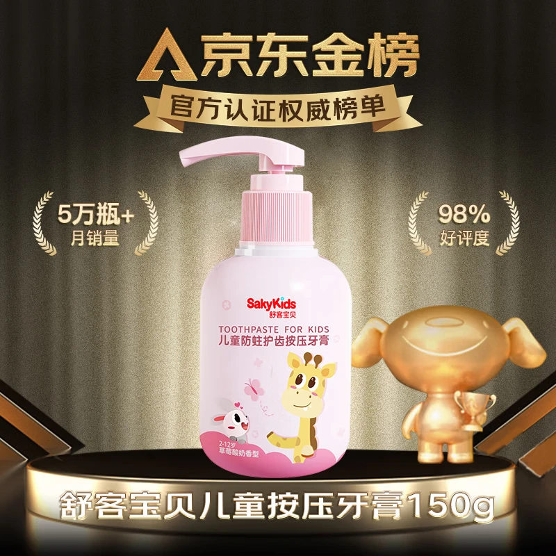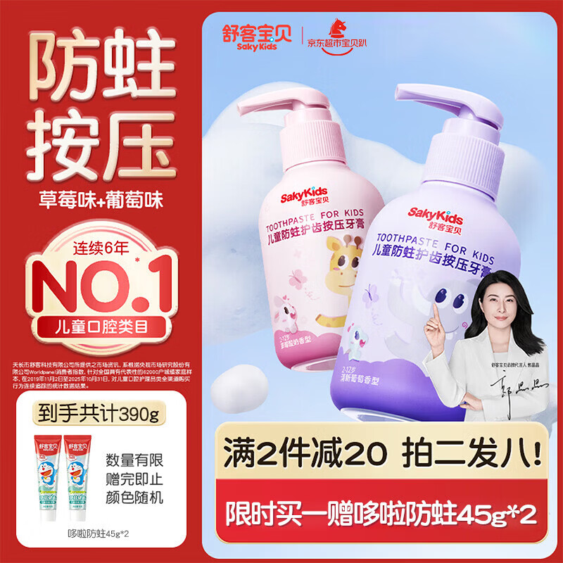 舒客宝贝儿童牙膏按压式150g大容量含氟防蛀2-16岁葡萄味+草莓味2瓶装