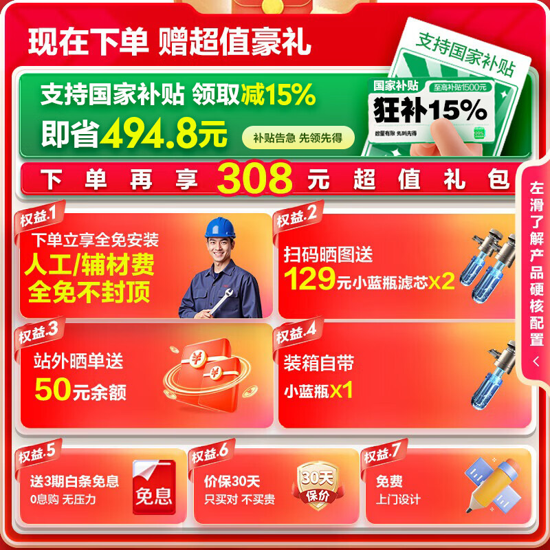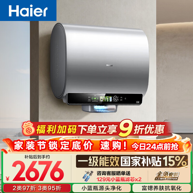 海尔【小蓝瓶净肤洗BK5】电热水器60升 国家补贴双胆扁桶富锶汤泉 锆金全瓷3300W速热家用一级能效