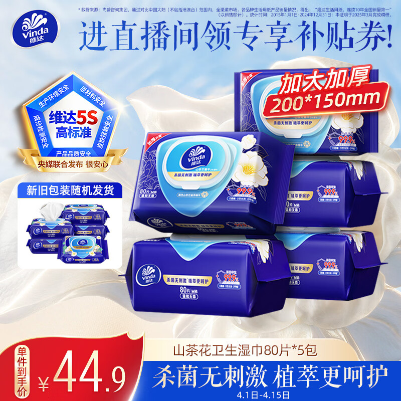 维达(Vinda)【孙颖莎推荐】杀菌湿巾 80片*5包 山茶花精华大包 新旧随机发货