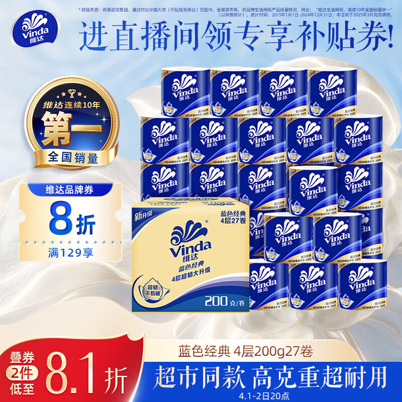 维达(Vinda)有芯卷纸 蓝色经典4层200克*27卷 高克重卫生纸 厕纸纸巾整箱