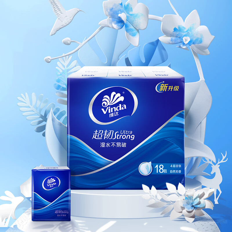 维达(Vinda)超韧手帕纸4层8片18包 出行必备 热销爆款大尺寸 无香便携装小包