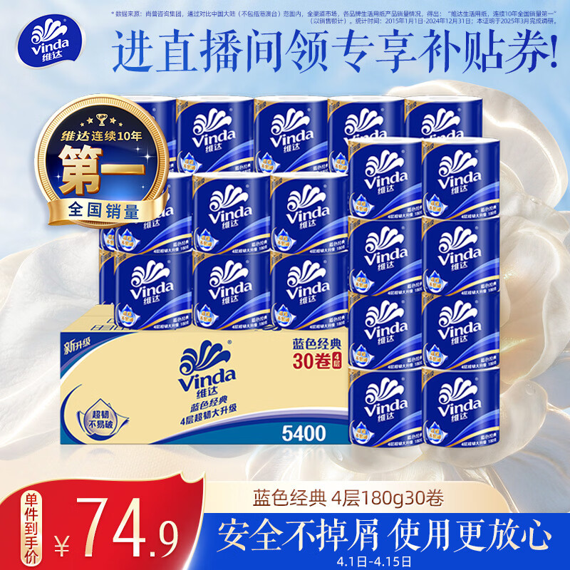 维达(Vinda)有芯卷纸 蓝色经典4层180克*30卷 加厚 纸巾 整箱