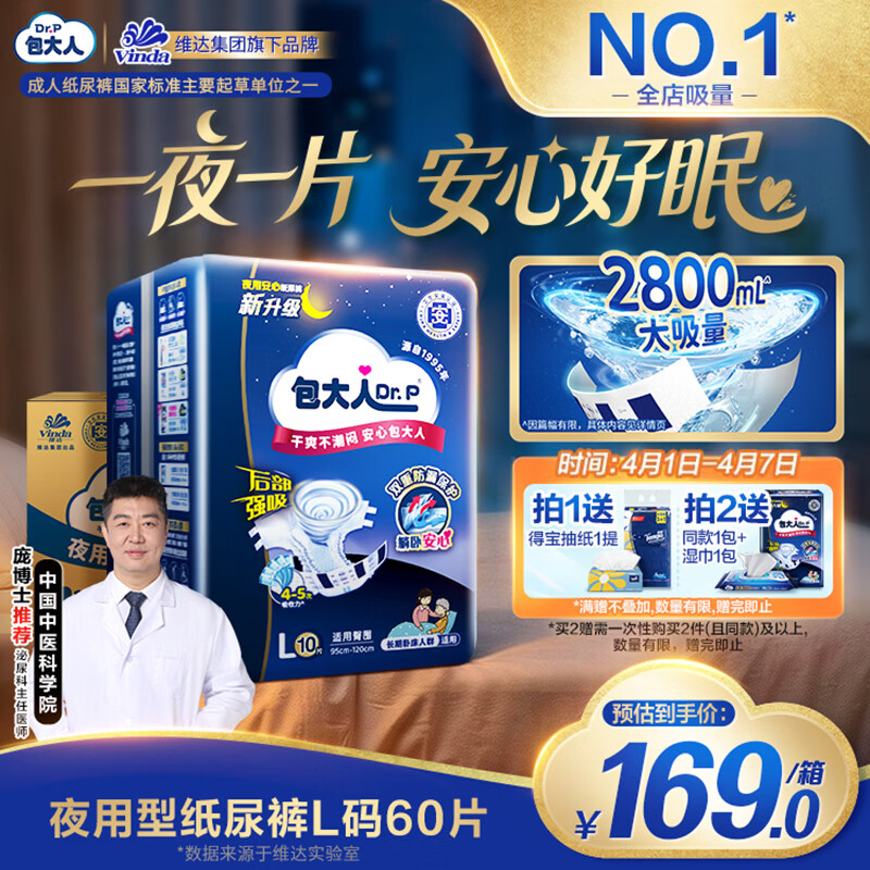 包大人(Dr.P)夜用型成人纸尿裤L60片 (腰围:85cm-135cm)老年人产妇尿不湿