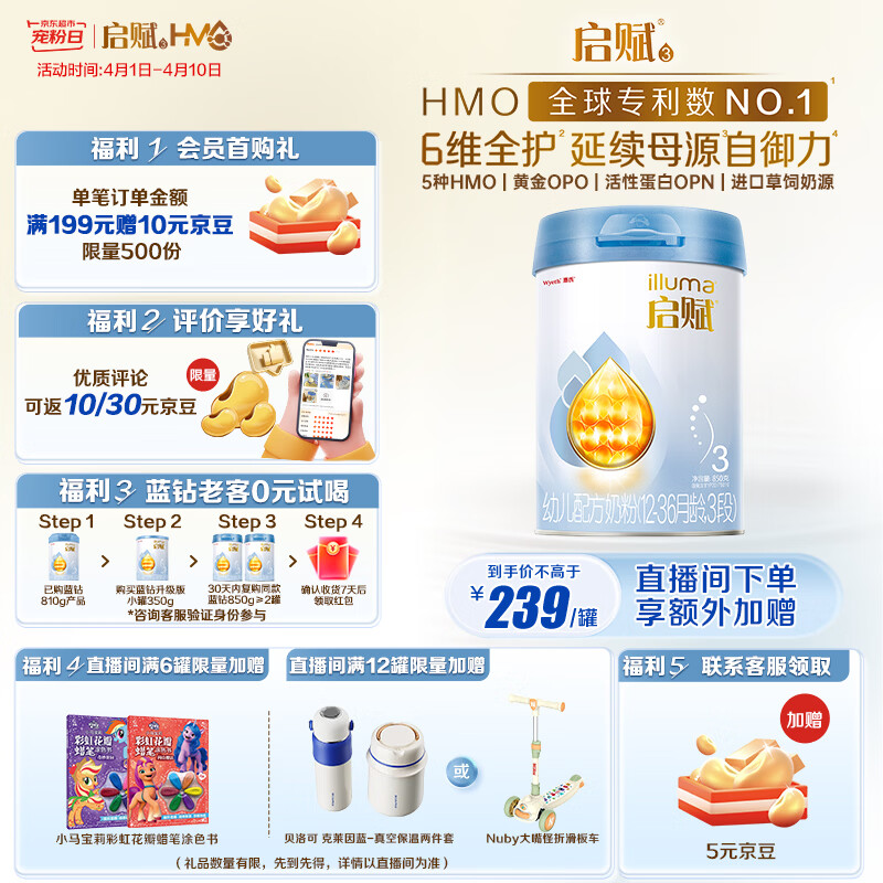 惠氏(Wyeth)启赋蓝钻【加量装】HMO幼儿配方奶粉3段(12-36月)850g 黄金OPO