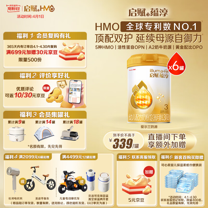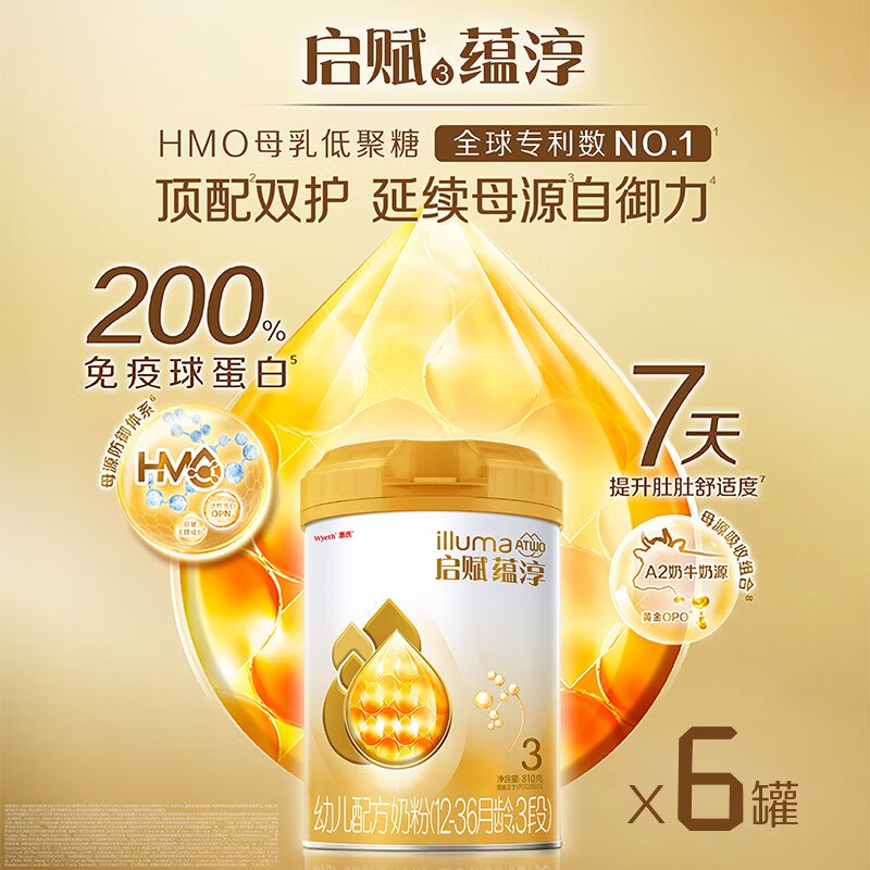 惠氏(Wyeth)启赋蕴淳进口幼儿配方奶粉3段(12-36月)810g*6罐 A2奶源HMO