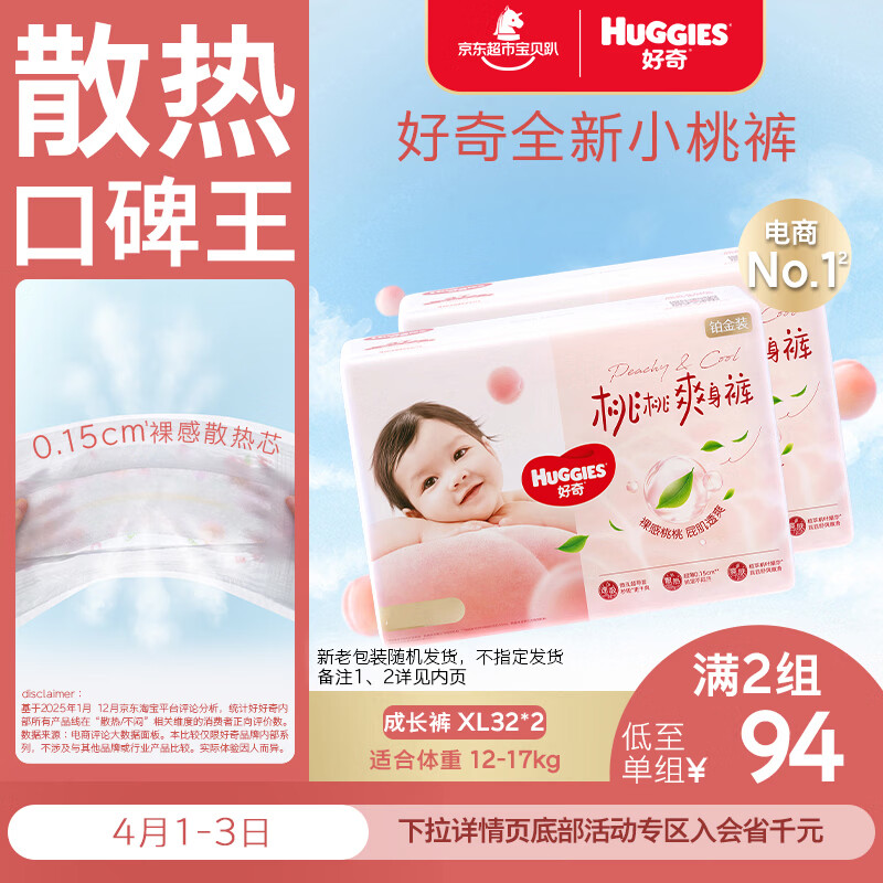 好奇(Huggies)铂金装小桃裤拉拉裤XL64片(12-17kg)加大号尿不湿【透爽散热】