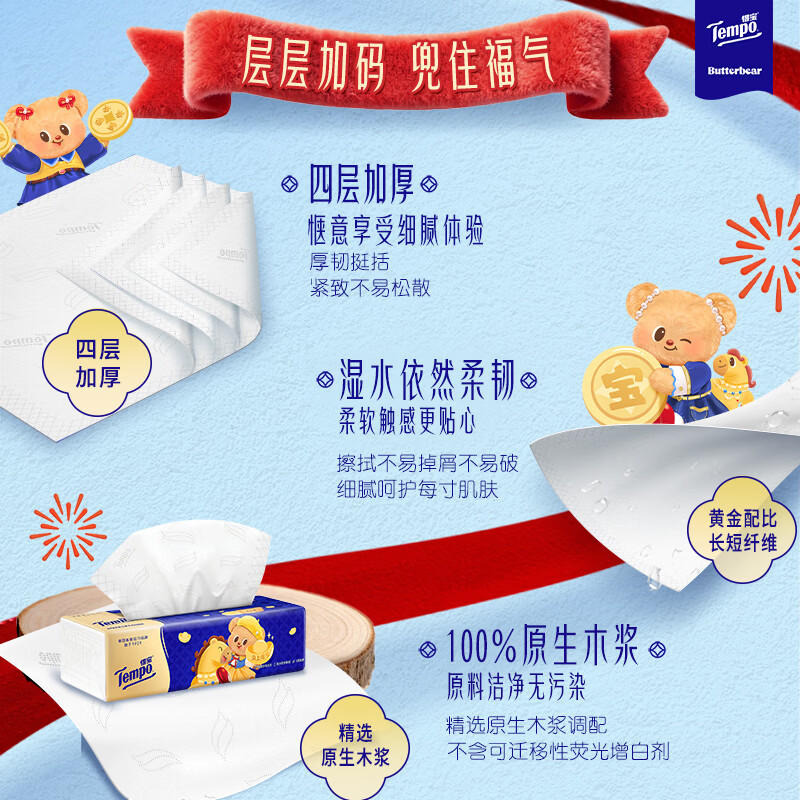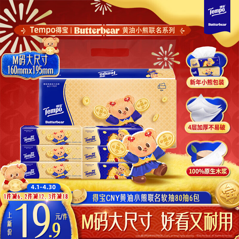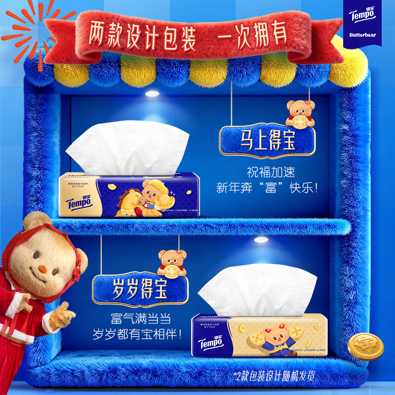得宝(TEMPO)黄油小熊马年限定款 无香抽纸 真M码 4层加厚80抽*6包 纸巾餐巾纸