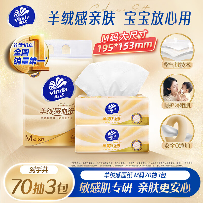 维达(Vinda)抽纸 羊绒感面纸70抽*3包M码 敏感肌适用 卫生纸纸巾 纸抽