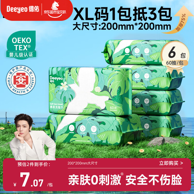 德佑洗脸巾60抽*6包抽取式加大加厚干湿两用一次性棉柔洁面绵柔巾