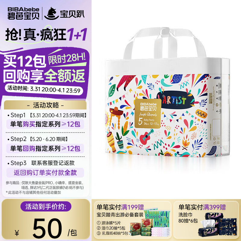 碧芭宝贝丛林狂想曲拉拉裤 婴儿成长裤宝贝训练裤透气大号尿不湿 拉拉裤XL34片(12-17kg)