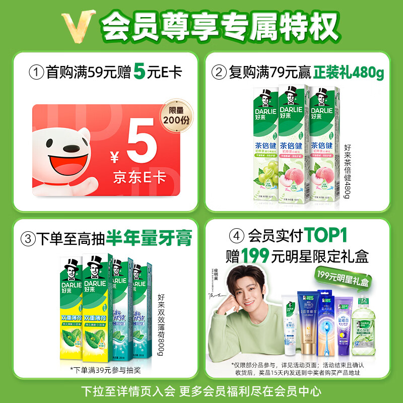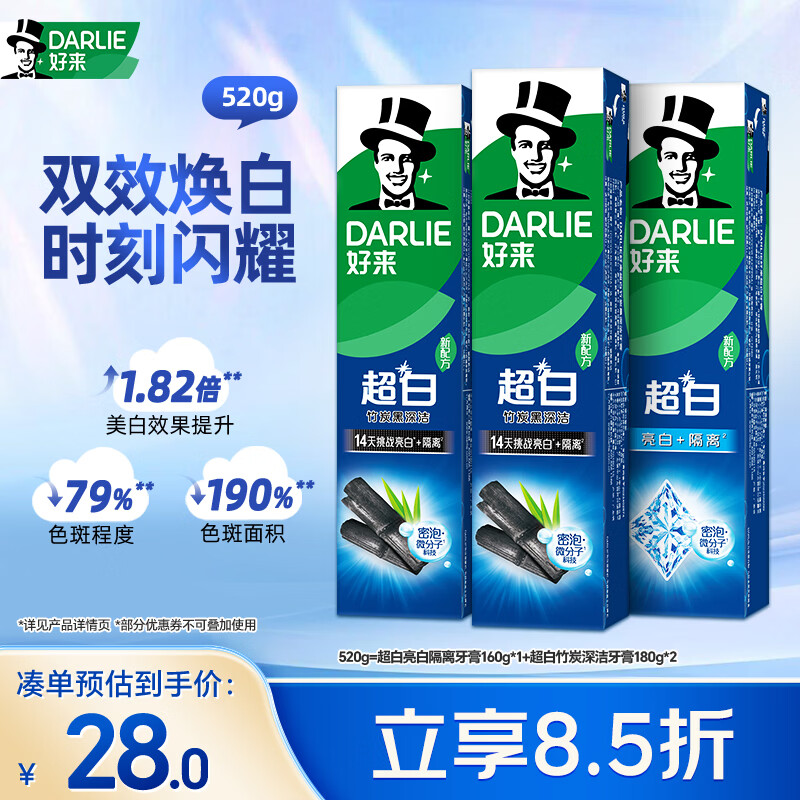 好来(原黑人)超白竹炭牙膏清新口气去黄去牙渍烟渍亮白3支共520g