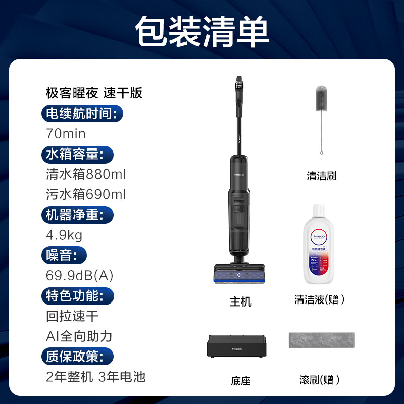 添可极客曜夜 速干版【回拉速干 25Kpa暴风吸】AI全向助力真防臭0缠毛躺平洗地机吸拖一体扫地机器人