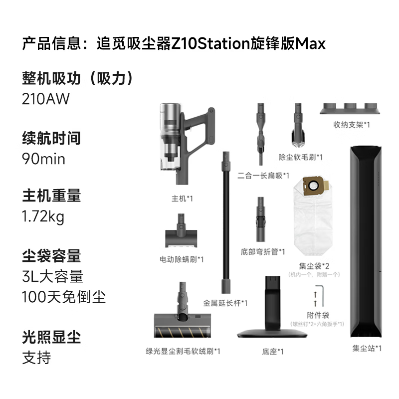 追觅【春晚合作】自集尘吸尘器 Z10 Station旋锋版MAX 家用无线手持 210AW大吸力 100天不动手防缠毛刷