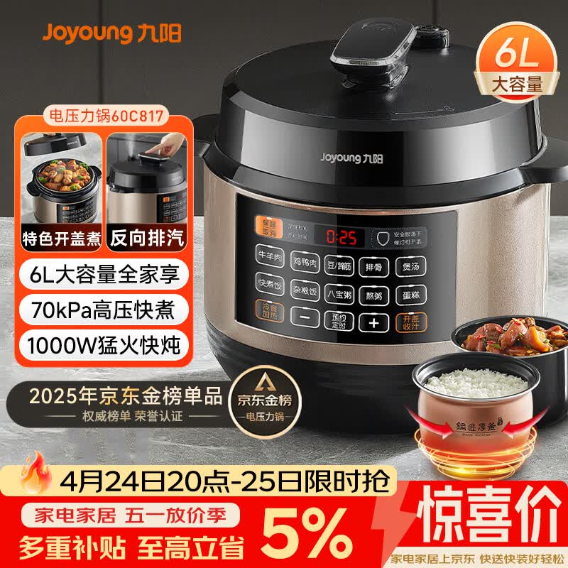 九阳(Joyoung)6L大容量电压力锅家用双胆全自动智能预约煲汤炖肉煮粥多功能Y-60C817电饭煲高压锅6-8人