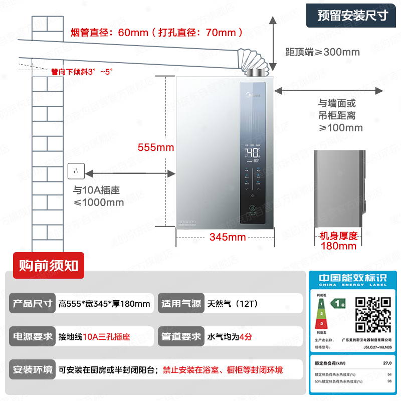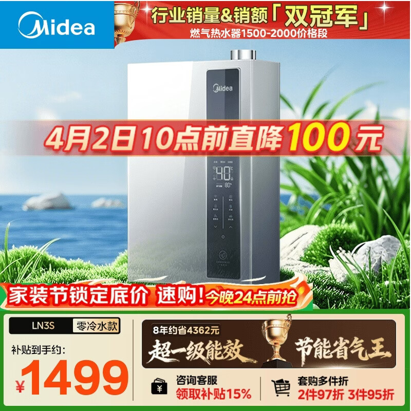 美的【超一级能效 LN3S零冷水款】16升双增压恒温瀑布浴 燃气热水器天然气【国家补贴15%】