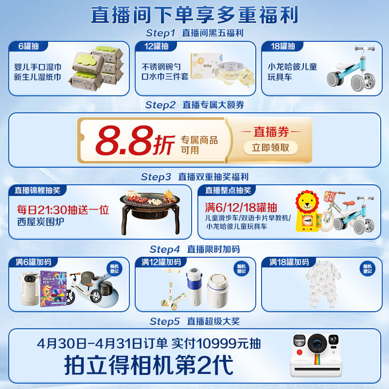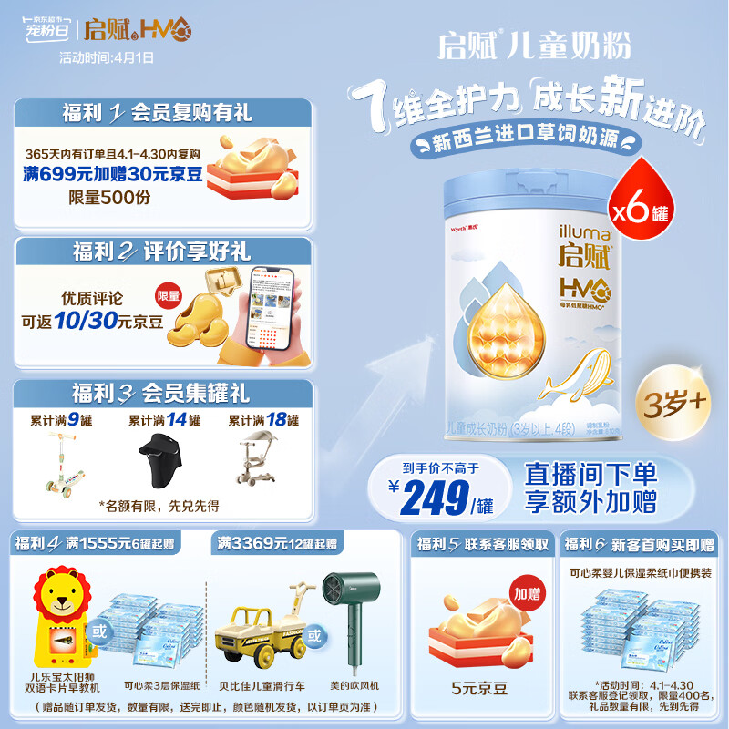惠氏(Wyeth)【全新7维进阶】启赋蓝钻4段 HMO儿童成长奶粉810g*6罐