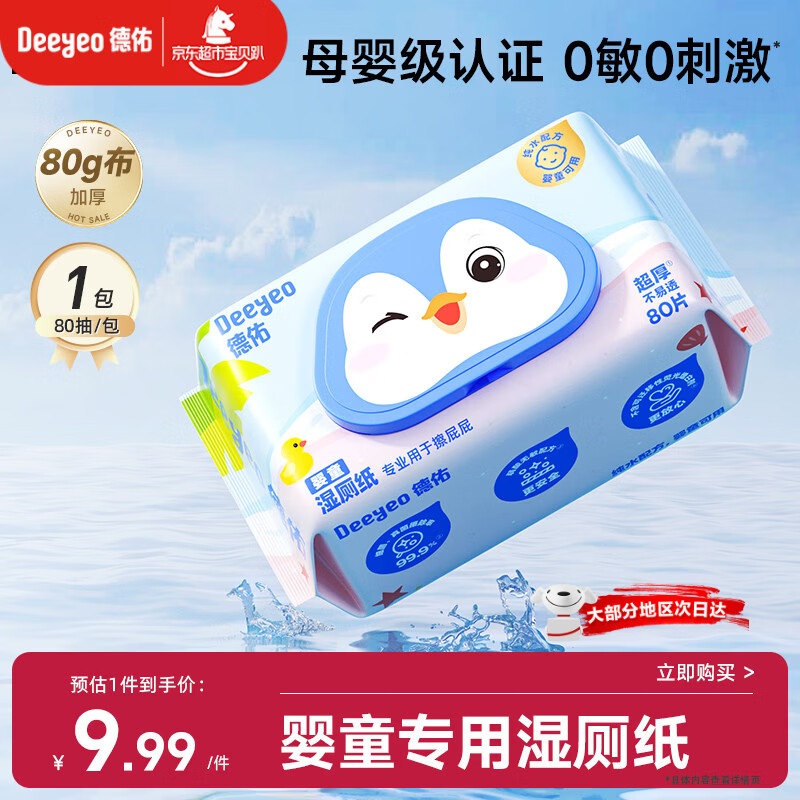 德佑婴童湿厕纸80抽1包体验婴儿红屁屁护臀专用洁厕湿巾纸0敏母婴通用