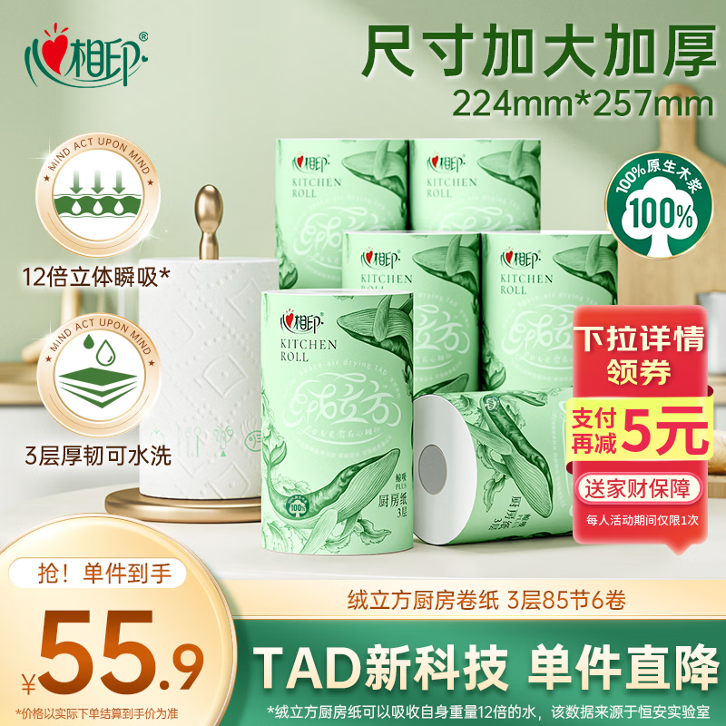 心相印绒立方厨房卷纸85节*6粒 12倍吸油锁水可接触食物 厨房专用纸巾