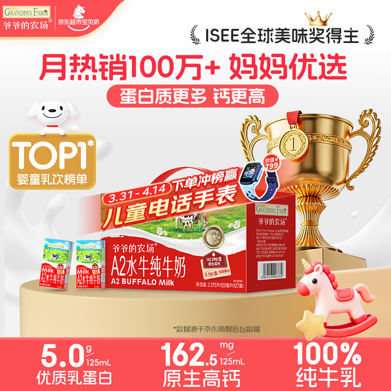 爷爷的农场A2β-酪蛋白水牛纯牛奶125ml*27盒 儿童早餐高钙宝宝水牛奶礼盒