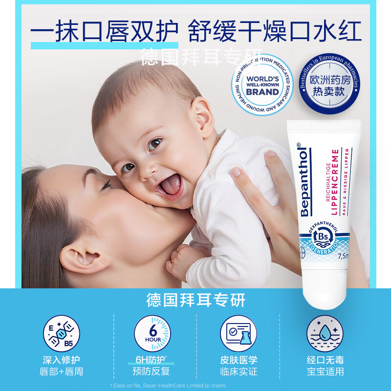 BepanthenB5精华唇膏拜耳口水膏7.5ml 宝宝润唇膏 婴儿护唇膏补水防干裂