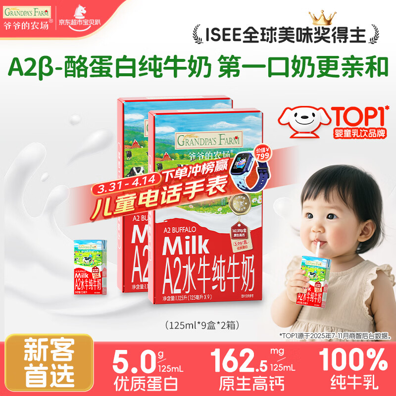 爷爷的农场A2β-酪蛋白水牛纯牛奶125ml*9*2箱 高钙儿童宝宝早餐学生水牛奶