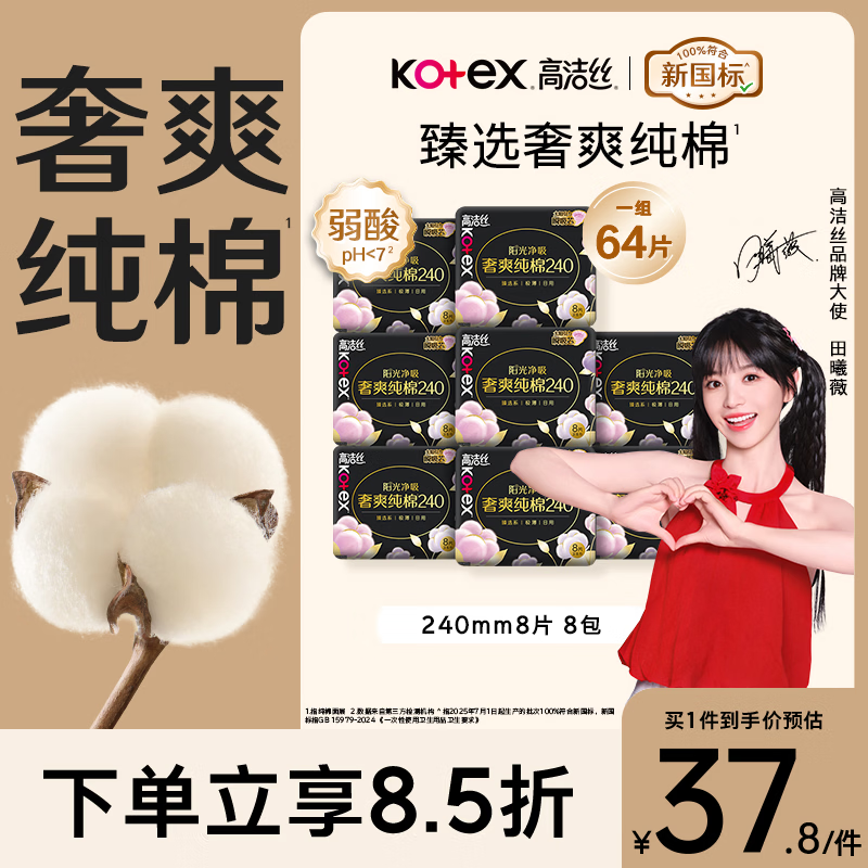 高洁丝【100%纯棉】臻选奢爽卫生巾240mm8片*8包日用姨妈巾京东自营旗舰