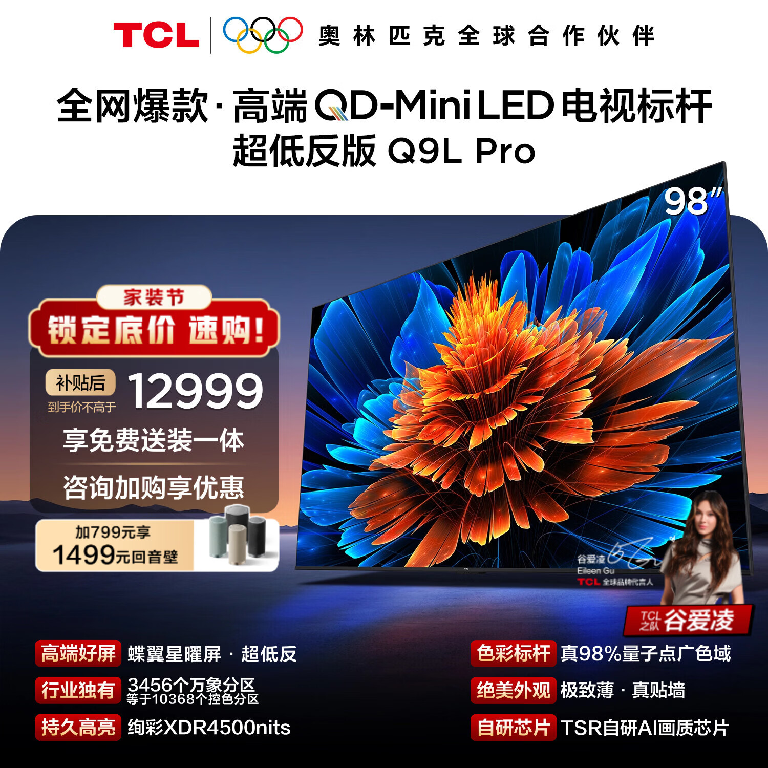 TCL电视 98Q9L Pro 98英寸 QD-Mini LED 蝶翼星曜屏 万象分区 绚彩XDR 98/100英寸 国家补贴 护眼
