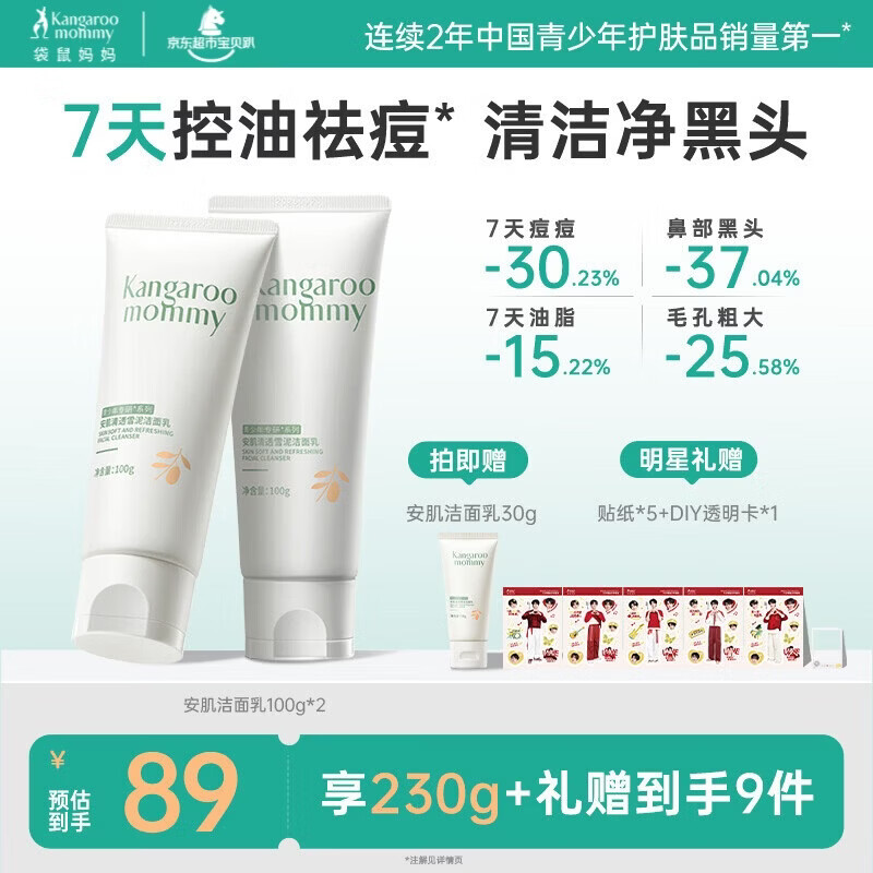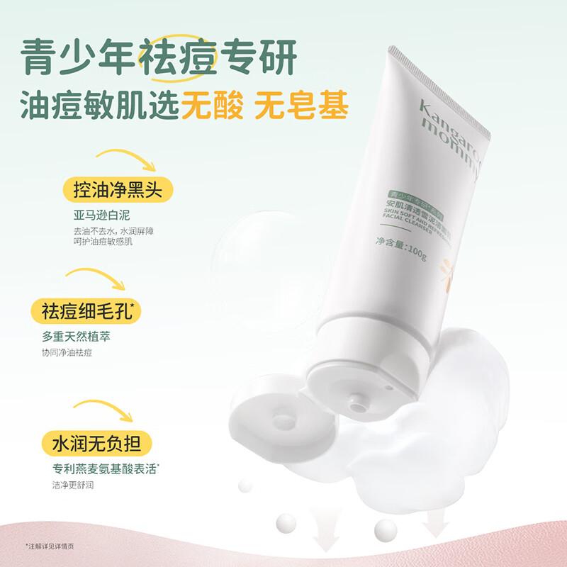 袋鼠妈妈青少年洁面乳 控油祛痘12-18岁青春期男女学生护肤 洗面奶 100g*2