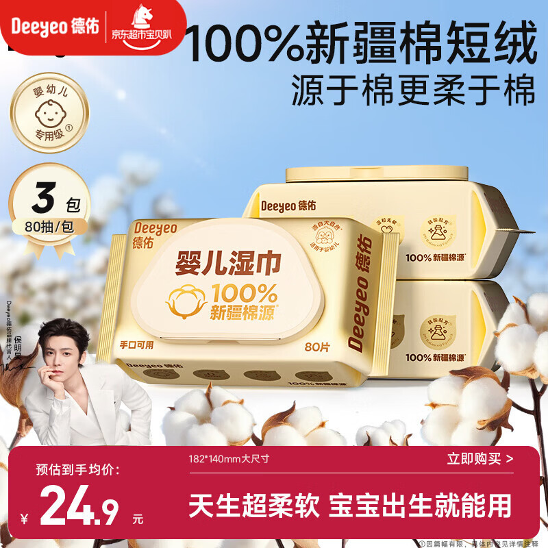 德佑超柔软100%新疆棉源手口湿巾 婴儿湿纸巾80抽*3包新生儿专用t