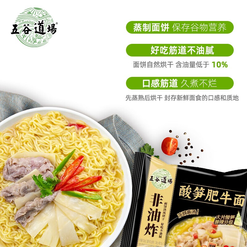 五谷道場非油炸方便面 酸笋肥牛面四连包129gx4袋装 袋面 早餐泡面 免煮