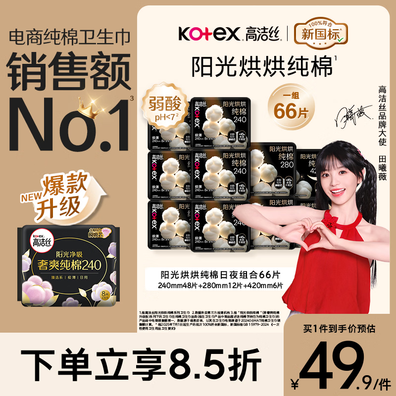 高洁丝【纯棉NO.1】阳光烘烘卫生巾10包66片日夜组合姨妈巾京东自营旗舰