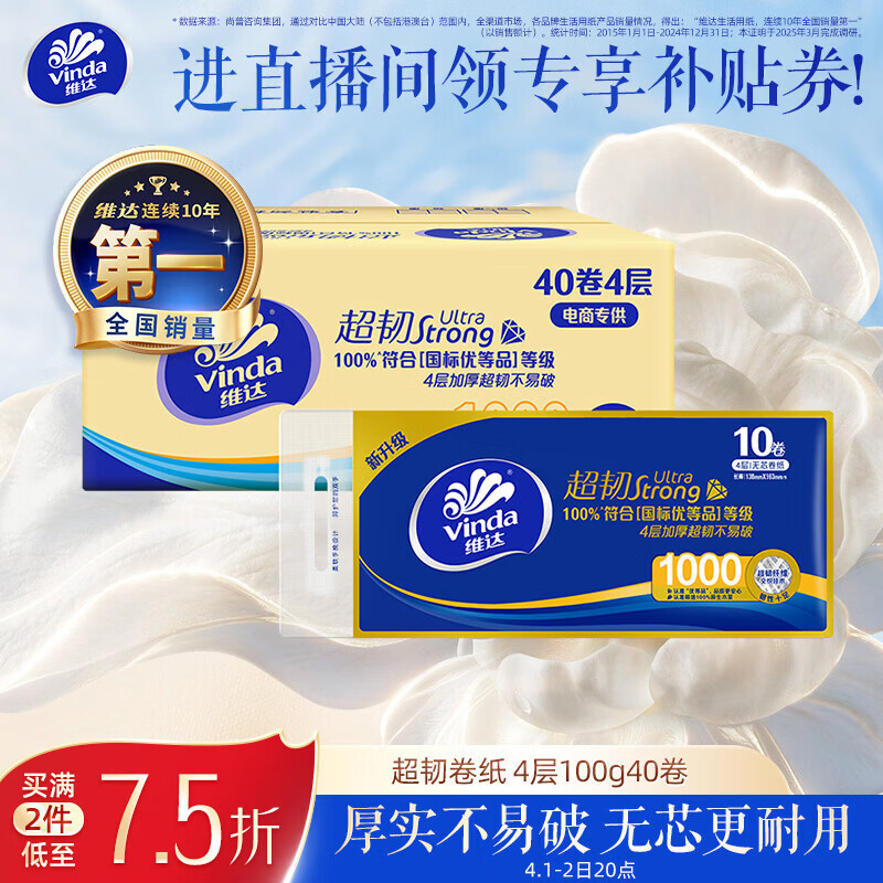 维达(Vinda)无芯卷纸 超韧4层100克*40卷 加厚升级 洁厕纸整箱 新旧随机发货