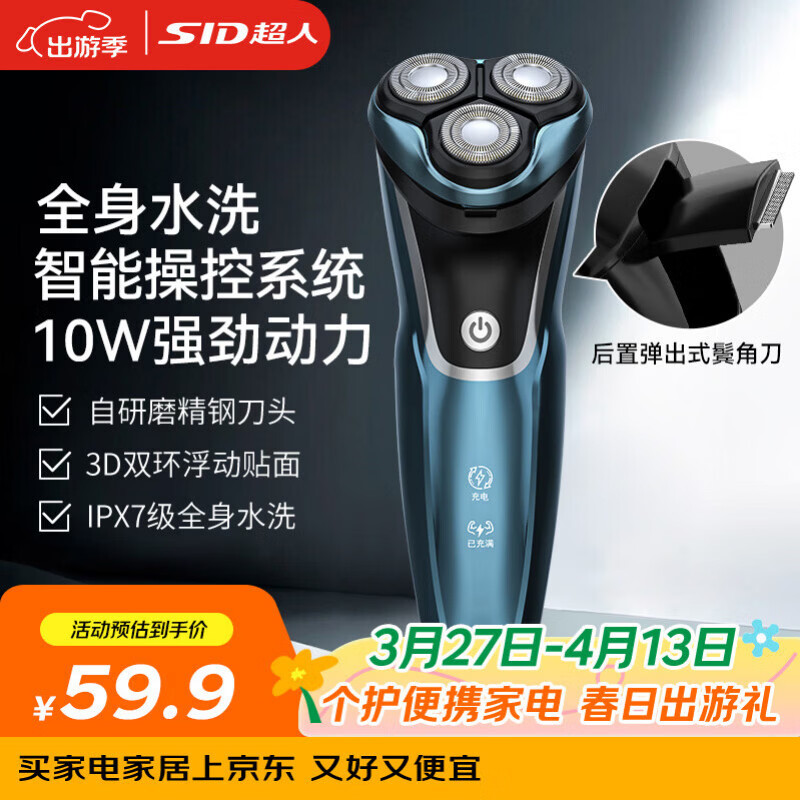 超人(SID)剃须刀便携款三刀头旋转式大功率男士电动刮胡刀全身水洗送男友 RS7335