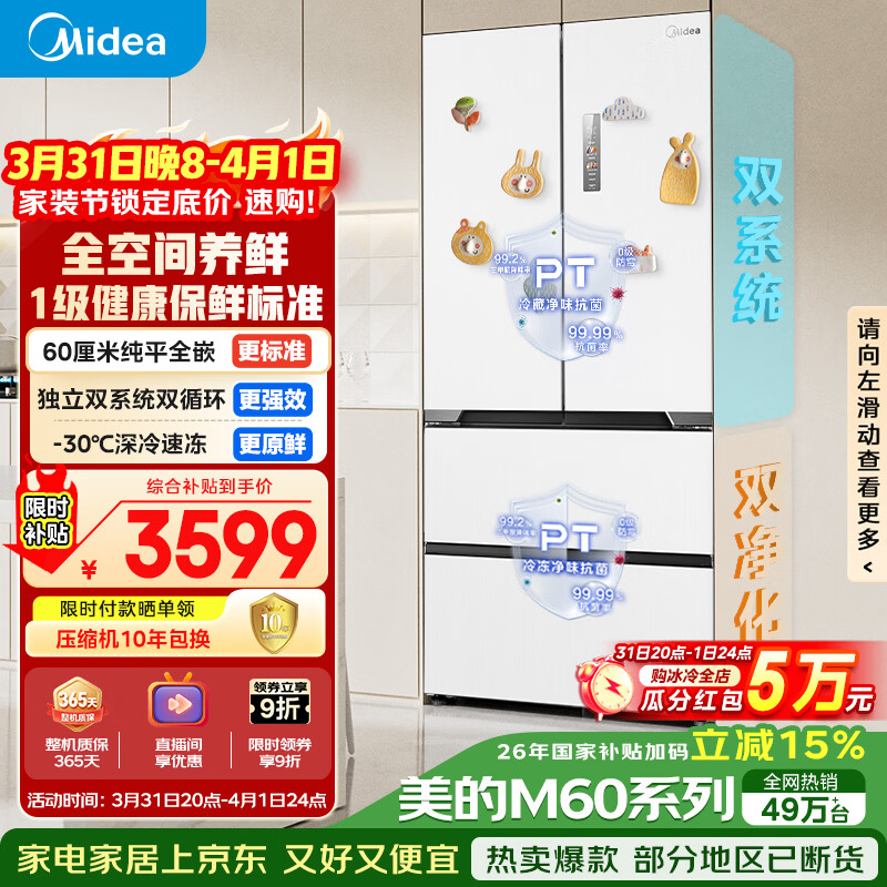 美的(Midea)536法式四开门冰箱511L大容量超薄嵌入式双系统一级能效风冷无霜以旧换新白MR-536WUFPZE国家补贴
