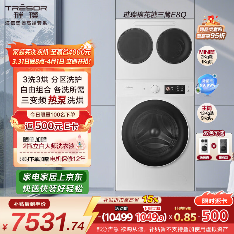 海信(Hisense)璀璨棉花糖热泵洗烘三筒洗衣机 分区洗全家筒活水健康自由组合 三桶WH130E8Q-1+WV20W以旧换新补贴