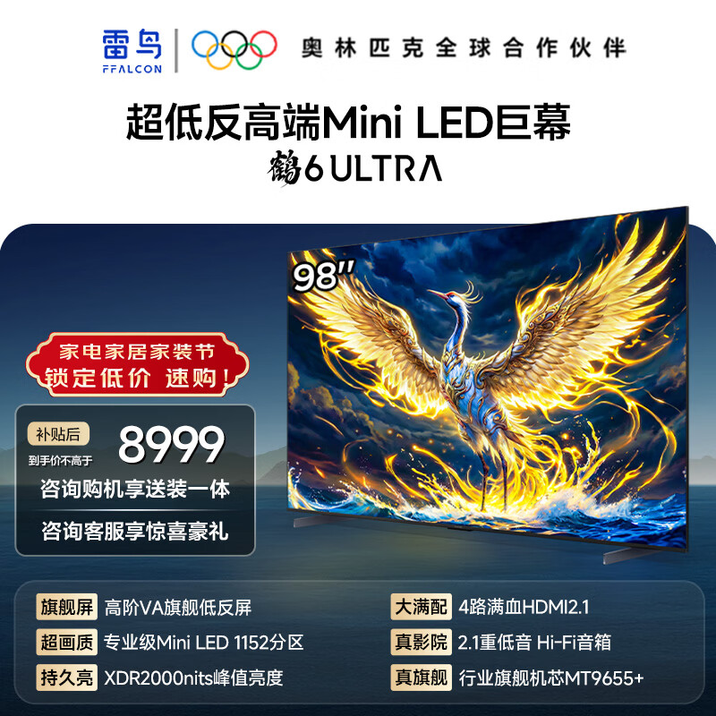 FFALCON雷鸟电视 98鹤6 Ultra 25款 98英寸 MiniLED 高阶VA 家电国家补贴 98/100英寸电视98S595C Ultra
